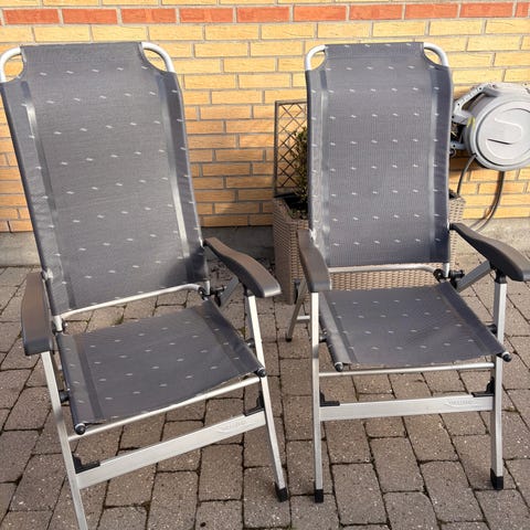 Wecamp campingstol i grå farve. Stolen har høj ryg og armlæn samt polstret sæde og ryg for ekstra komfort. Stellet er i metal, og stolen er egnet til brug ved campingbord eller som udendørs havestol. Det medfølger 4sorte hynder pris for stolene 600kr stk campingbord med justerbar ben mål er 87 x 130 pris 800kr eller en samle pris ??? Eller kom med bud