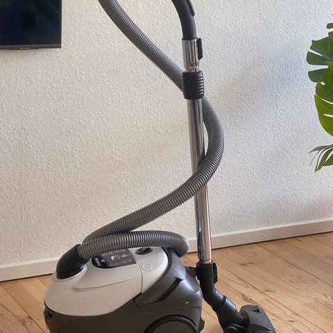 Nilfisk Coupé støvsuger i rød og sort. Modellen er en kompakt pose-støvsuger med teleskoprør, fleksibel slange og tilbehør integreret i selve støvsugeren, herunder mundstykker til forskellige overflader. Støvsugeren anvender støvsugerposer og har udskifteligt filter, som vist på billederne. Egnet til almindelig rengøring af gulve og tæpper i hjemmet. 1550w