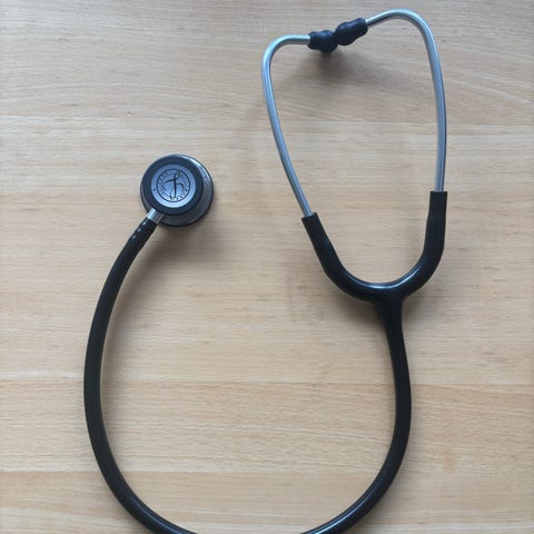Fint ældre stetoskop med klassisk sort slange og metalbøjler fra ca 1970-1980