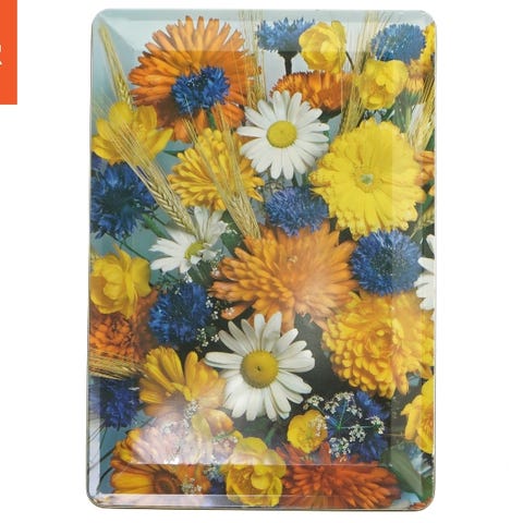 Dette er en rund vintage metalkagekasse med blomstermotiver. Kassen er primært rød med en guldfarvet kant og detaljerede blomsterdekorationer i forskellige farver rundt om periferien på låget og kroppen. Indvendigt er metallet udsat med tegn på patina, hvilket indikerer aldringsprocessen.