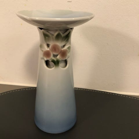Hvid og blå keramisk vase med gradient farveeffekt fra hvid til blå. Vasen har et dekorativt blomstermotiv og en svinget kant.
