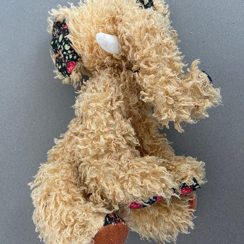 Grå plys elefant tøjdyr med lyserøde detaljer på ørerne og fødder. Stor glitrende øjne. Meget blødt og krammeligt materiale.