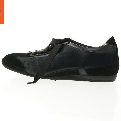 Et par sorte Alberto Guardiani sportsko i læder med præget mønster. Skoene har sorte snørebånd og en hvid mærkelogo på pløsen. Indvendigt er der en vinrød indersål med brandnavn præget. Ydersålen er lavet af sort gummi med forskudte mønstre og brandnavnet præget. Skoene inkluderer en matchende sort stofpose med brandnavnet trykt i hvid.