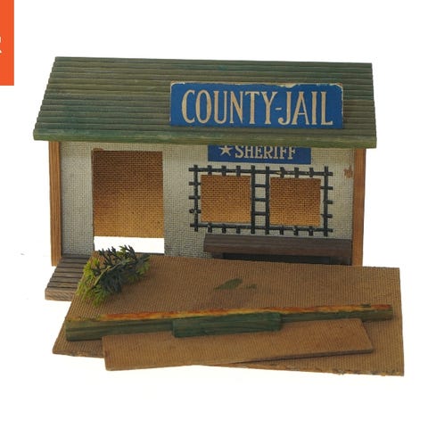 Miniature facade of a York Hotel with a Western theme. The structure features two window openings and pillars at the front. Made of wood and painted with details resembling a Western saloon including 'WHISKY' boxes. The structure is hollow at the back.