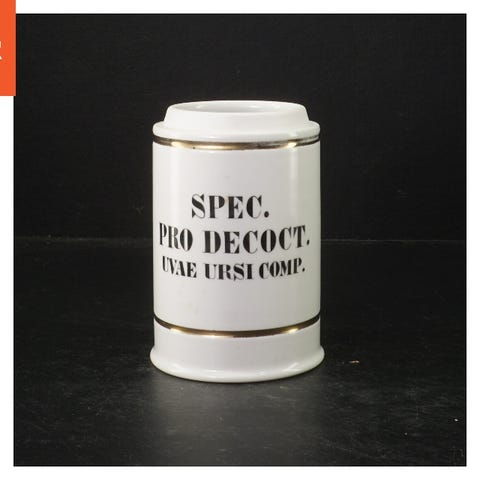 Hvid keramik apotekerurtepotte uden låg. Urtepotten har en sort tekst 'SPEC. PRO DECOCT. UVAE URSI COMP.'. Der er synlige brugstegn og misfarvning på låget, tydelige skilinjer samt nogle rustlignende pletter på metalbåndet nær bunden.