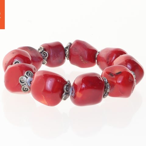 Dette er et dekorativt armbånd bestående af flere runde perler med indlagte farvede mønstre og nogle få perler dekoreret med klare sten. Armbåndet virker til at være lavet i en metallegering med en ældre, måske vintage, udseende og forskellige farveindlæg, herunder rød, turkis og sorte detaljer.