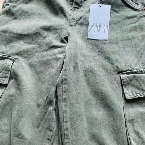 Blå cargo bukser med elastisk talje og ribkant ved anklerne. Bukserne har store lommer på siderne af benene samt skrålommer foran. Bagerst findes et mærke nær linningen.