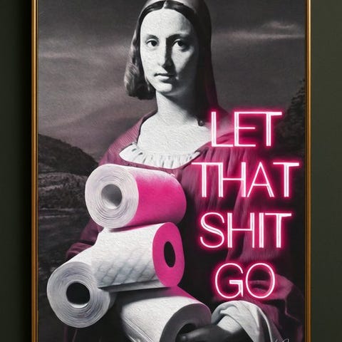 En ung renæssance-dame, tydelig reference og genfortolkning af Dronningen med odderen, går ind i smartphone-æraen. Hun holder en ramme foran ansigtet og rækker armen ud for et selfie med en appelsinfarvet telefon. Rammen begrænser ikke, den sætter scenen. Det klassiske portræt bliver en samtidsperformances, hvor posen er budskab, og identiteten bygges foran kameraet.