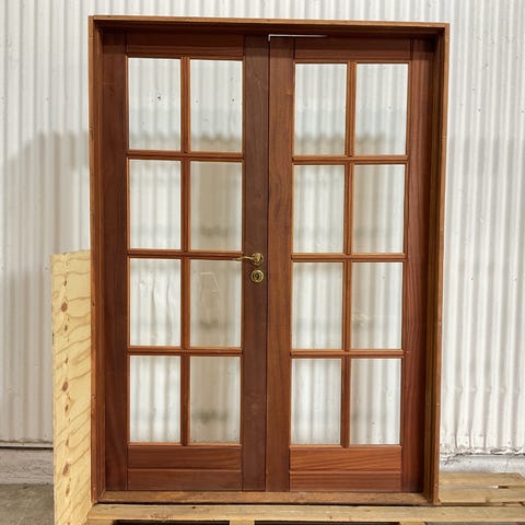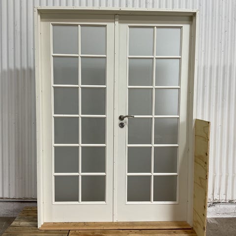 Brugt Indvendig Dobbeltdør, træ/træ, 1 lag glas, hængt på begge sider, hårdttræsbundstykke, døren har matteret folie på og kan tages af, mål: H209,2 B151,5 D13 Varenummer: 1859