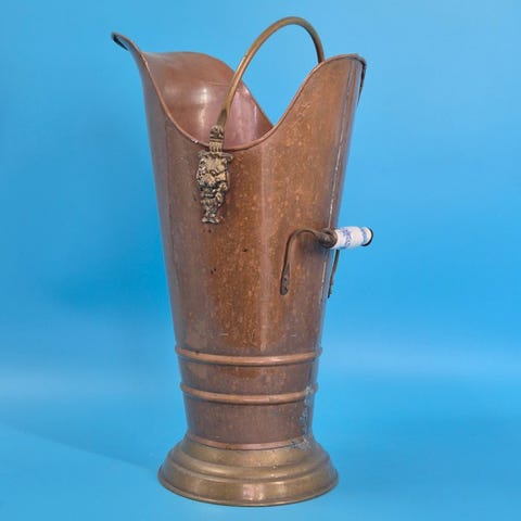 til salg står en dekorativ, antik kulbeholder af messin g, som imponerer med sin klassiske formgivning og håndværksmæssige udførelse. Objektet er udstyret med markante løvehoved-holdere og blå- og hvide udskårne porcelæns greb.