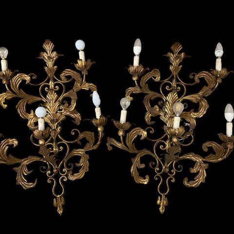 Stor vintage vægapplique karakteriseret ved et indviklet blomsterdesign i smedet jern eller forgyldt metal, ofte tilskrevet italiensk eller fransk håndværksproduktion fra midten af det 20. århundrede ..., med 5 grene og lige så mange lyspunkter i form af stearinlys.