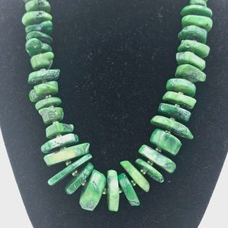 En elegant halskæde udført i rustfrit stål og sat med en række blødt buede jade cabochoner, anbragt i et flydende, artikuleret design, der følger halslinjen med ynde. Den blide gennemsigtighed og ensartede blågrønne tonality af jade-stenene skaber en raffineret og beroligende visuel effekt, suppleret af den polerede rustfrit stålstruktur og en generøs kædelængde.