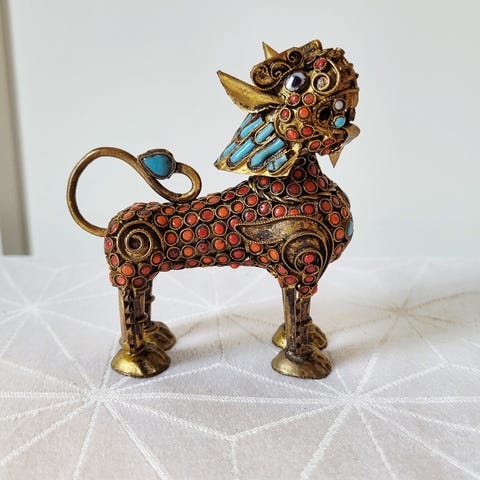 Et par bronzestøbte kinesiske foo-hunde, hver 21 cm høj, 11,5 cm bred, 9,5 cm dyb, vægt 3,7 kg, signeret og i god stand, oprindelse Kina. Klik på den blå "gå til varen" knap, for at købe eller byde på denne vare. Den samlede pris vil blive vist inden du afgiver dit bud.