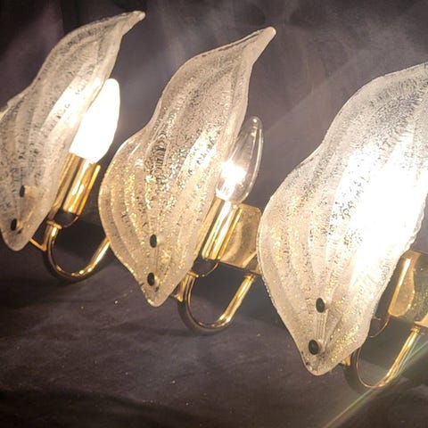 Tre væglamper med florermønster i messing og Murano-glas, model applique a fiori, lavet i Italien, fra 1960–1970, i god brugt stand med let aldersrelateret patina og i funktion. Klik på den blå "gå til varen" knap, for at købe eller byde på denne vare. Den samlede pris vil blive vist inden du afgiver dit bud.