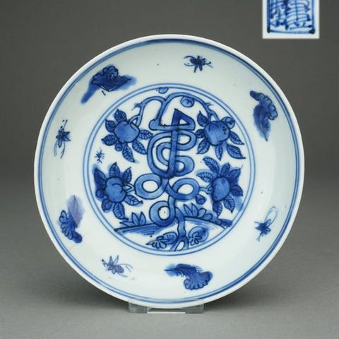 En smuk gammel kinesisk porcelænsplatte med en central udsmykning af en frygtindgydende drage midt i ildskyer omgivet af lotus, pæoner, krysantemumer og orkideer, udført i en smuk underglas blå og hvid. I kanten en klassisk dekoration af blomsterornamenter med ruyi-hoveder, typisk for Yuan- og Ming-dynastiets stykker. Dette stykke har bestemt en vis alder, det blev samlet i 1980’erne. Fremragende kvalitet og håndværk.