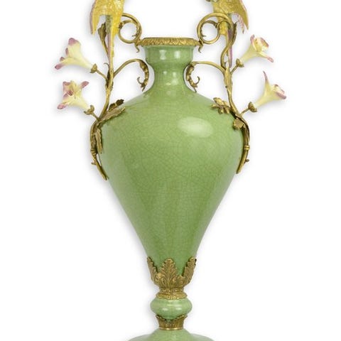 En stor porcelænsvase med craquelé glasur, håndmalet emalje, fod og kant i bronze, 40 cm høj og 24 cm bred, fra det 20. århundrede, i fremragende stand. Klik på den blå "gå til varen" knap, for at købe eller byde på denne vare. Den samlede pris vil blive vist inden du afgiver dit bud.