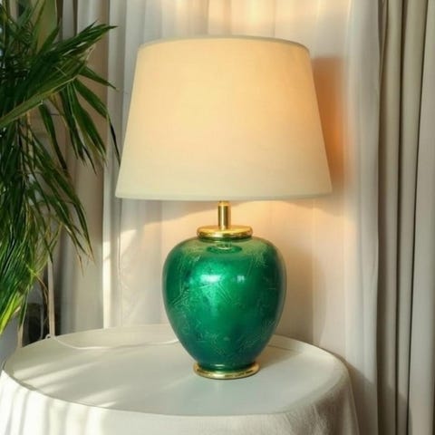 Stor mørkegrøn Art Déco lampe af Robert de Schuytener, lavet i Frankrig, af keramik, messinge og guldtone metal, 80 cm høj med skærm på 52 cm, model Sapporo, i god brugt stand og i funktion. Klik på den blå "gå til varen" knap, for at købe eller byde på denne vare. Den samlede pris vil blive vist inden du afgiver dit bud.