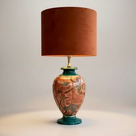 Smuk stor mørkegrøn lampe af Robert De Schuytener i keramik, messing og guldbelagt metal, fremstillet i Frankrig.