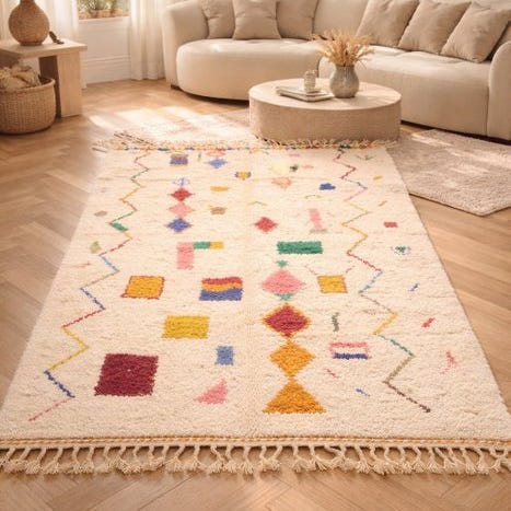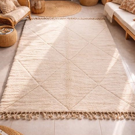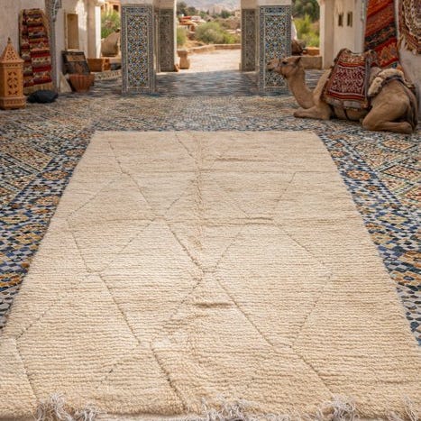 Dit imponerende Berber-tæppe på 300 x 208 cm er håndvævet i hjertet af Atlasbjergene. Et unikt stykke, helt udelukkende uld på uld, hvor tradition, symbolik og følelse mødes.