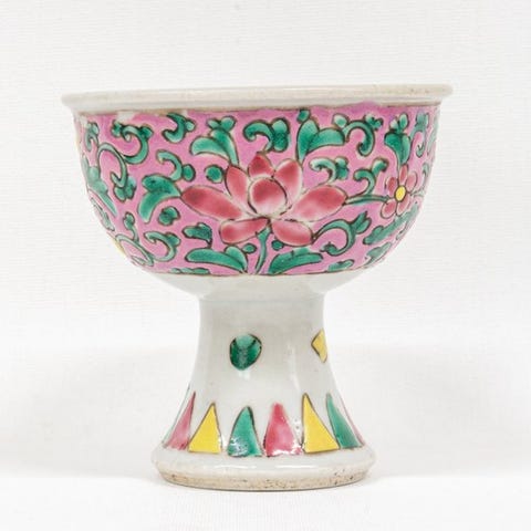 Dekoren er udført i polykrome emaljer af typen Famille Rose, med jernrøde højdepunkter.