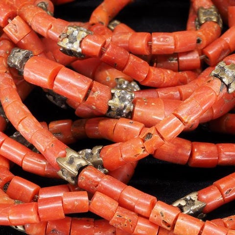Meget gammelt nomade-smykke fra tibetanere eller mongoler, med i midten en enestående stor perle af rød koral (i en fantastisk mørkerød farve!), omgivet af store perler af lapis lazuli og turkis.