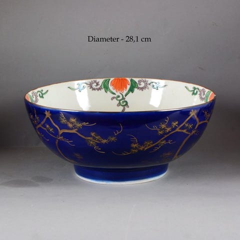 En stor kinesisk punchbolle i monokrom blå, med guld og famille verte. Kina, Qing-dynastiet, sene 1700-tallet eller 1800-tallet. Meget sjælden, især uden skader!