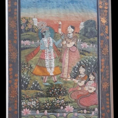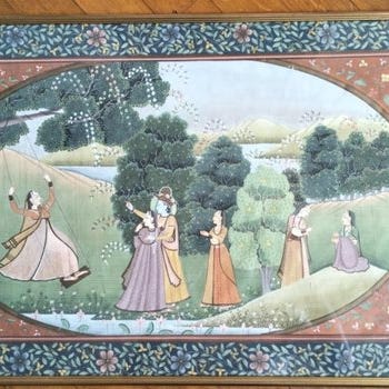 Fremragende indisk maleri i stort format på ca. 53x73 cm i god stand med den klassiske teknik inden for indisk maleri på stof, meget vintage fra 60'erne med imponerende ramme 69x88cm