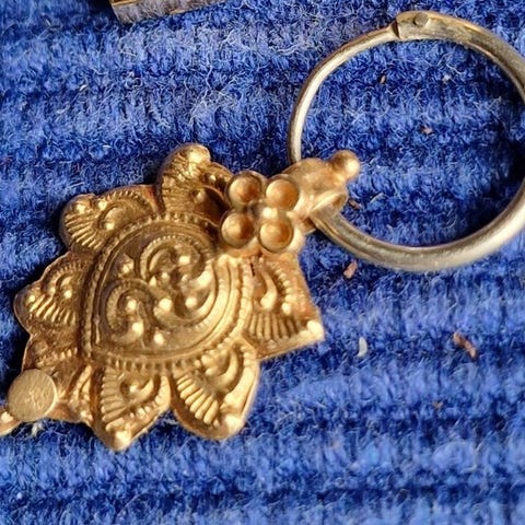 Collier i 22 karat guld er et produkt af Punjabs traditionelle håndværk, en historisk region delt mellem Indien og Pakistan. Det centrale medaljon forestiller en hindugudinde, sandsynligvis Lakshmi (lykke og rigdom) eller Shri, ofte afbildet siddende på en lotus. Lignende vedhæng findes i religiøse amuletter og historiske indiske mønter, som dem fra Gupta-perioden. Kæden består af store led med lakfyldning, i guld med hamret overflade, typisk for den punjabi folkestil, der bruges ved festlige lejligheder eller til traditionelle danse som Bhangra eller Gidda. Som omkreds