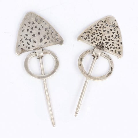 Par af berberfibler fra Zaians- og Ait Hadiddou-stammerne, begyndelsen af det 20. århundrede, sølv, oprindelse Marokko, autentisk/original, vægt 237 g, fra privat samling, i god stand. Klik på den blå "gå til varen" knap, for at købe eller byde på denne vare. Den samlede pris vil blive vist inden du afgiver dit bud.