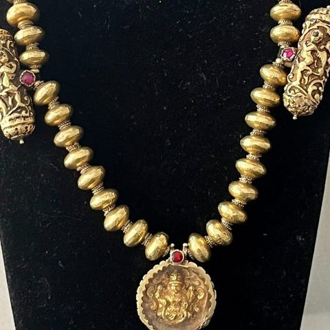 Egyptisk-inspireret halskæde med tre vedhæng i massivt sølv og et centralt guldfarvet panel, samlet vægt 50 g, 9 karat, nubisk oprindelse, fra det 20. århundrede, i meget god stand. Klik på den blå "gå til varen" knap, for at købe eller byde på denne vare. Den samlede pris vil blive vist inden du afgiver dit bud.