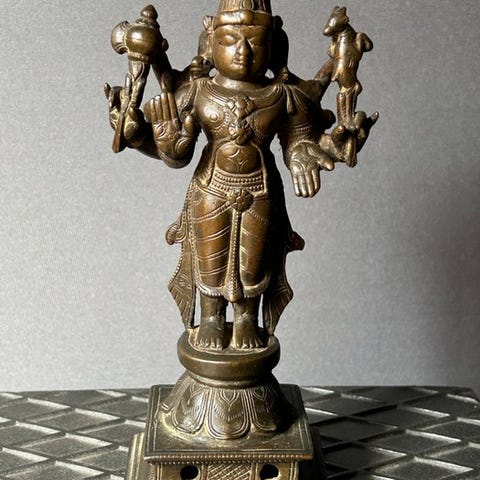 Bronzestatue af Yuanshi Tianzun, The Jade Pure One (Yuqing 玉清), kinesisk dynastisk stil fra det 20. århundrede, højde 36,5 cm, bredde 18 cm, dybde 18 cm, vægt 5,6 kg, stammer fra privat samling, i god stand og autentisk/original. Klik på den blå "gå til varen" knap, for at købe eller byde på denne vare. Den samlede pris vil blive vist inden du afgiver dit bud.