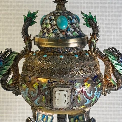 Bronzen røglasfigur i seneste 20. århundredes dynastistil fra Kina, med titel Bijzonder fabeldier wierookbrander 30 cm / 3.2 kg, mål 30 x 16 x 16 cm, stemplet i bunden, i god brugt stand med tegn på ældning, provenance Privécollectie, autentisk/original. Klik på den blå "gå til varen" knap, for at købe eller byde på denne vare. Den samlede pris vil blive vist inden du afgiver dit bud.