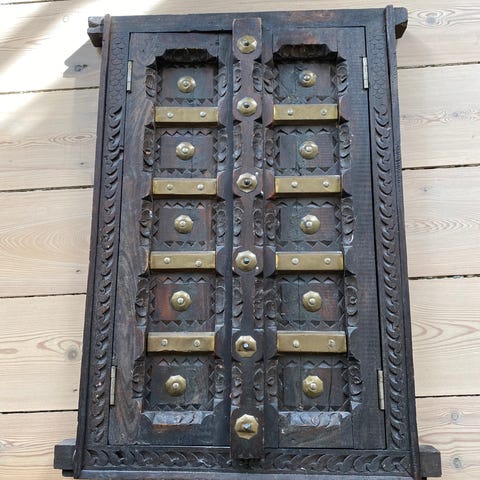 Bevarer original patina, hæftet konstruktion og traditionelt håndværk. Døren og låsen fungerer korrekt, og glassene er komplette, faste og i god stand, med uregelmæssigheder som typisk gammelt glas.