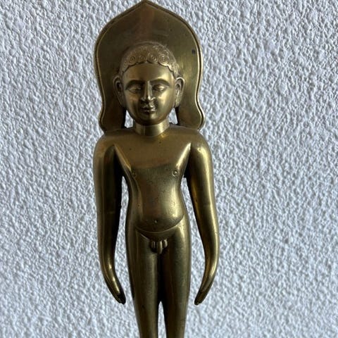 Vandsculptur i bronze, forestiller Tīrthaṅkara Pārśvanātha, den treogtyvende lysende mester i jainismen, fremstillet i oprejst position (kāyotsarga), ifølge canonisk Digambara ikonografi. Figuren, nøgen og slank, har armene udbredt langs siden og hænderne vendt indad, i en holdning af fuld asketisk afstandtagen. Ansigtet, med halvlukkede øjne og rolig udtryk, afspejler idealet om dyb meditation og åndelig frigørelse.