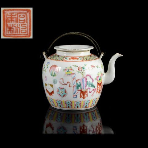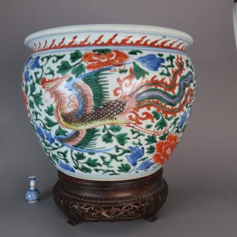 Denne meget sjældne porcelænsgenstand er dekoreret med wucai-emaljer og formet med indehlabede hjørner, hvilket giver en raffineret og distinkt silhuet. Låget er malet med fem kranier med medaljoner sat mod en tågefyldt bund, kranerne symboliserer lang levetid og gunstig lykke. Hver side er yderligere dekoreret med to chrysantemum-blomster og svungne blade, mens