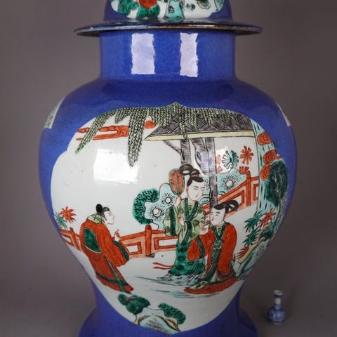 En dejlig stort og sjældent antikt kinesisk porcelænsvas med en central udsmykning af hundredevis af sammenhængende lotusblomster, udført i en flot underglazé blå og hvid. Øverste kant med en klassisk dekoration af geometriske mønstre. Håndlavet i det gamle Kina under Qing-dynastiet, Kangxi-perioden (ca. 1690). På bunden en høj hævet fod med dobbelte cirkler, inklusive et sølvlåg fra det 19. århundrede (eller ældre). Garanteret original og fra den angivne periode.