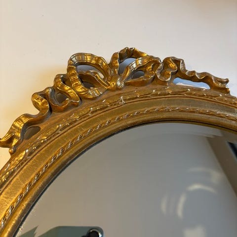 Til auktion er et fantastisk konveks spejl, udsmykket med detaljeret gildet udsmykning og blomster- og bladmotiver, der minder om klassisk barokk elegance.