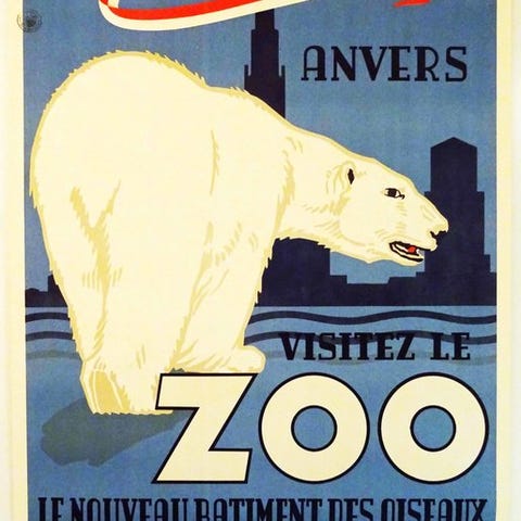 Original offsetlitografi / reklame-plakat fra 1950 til Zoo Antwerpen med motiv af isbjørn 'Anvers - visiter le Zoo - le nouveau bâtiment des oiseaux, l' aquarium et le musée'.