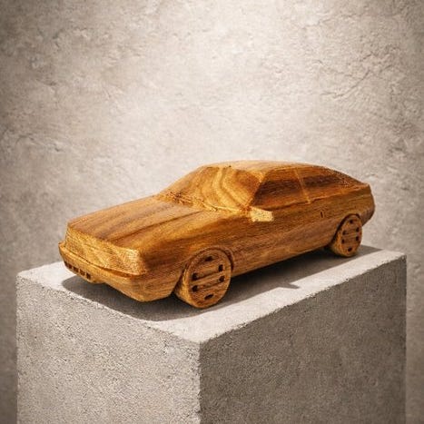 Fremstillet i mahognitræ og afsluttet med naturlig olie, der fremhæver de varme åretegninger, er dette modelten tænkt som udstillingsobjekt for bilentusiaster og elegante indretningsmiljøer. Hjulene er fastgjort til karrosseriet, hvilket skaber en harmonisk og kontinuert sculptural form.