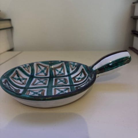 Keramikfad af Robert Picault, Frankrig, ca. 1940–1950, i god brugt stand med små aldersspor, målene 14,5 x 18 cm. Klik på den blå "gå til varen" knap, for at købe eller byde på denne vare. Den samlede pris vil blive vist inden du afgiver dit bud.
