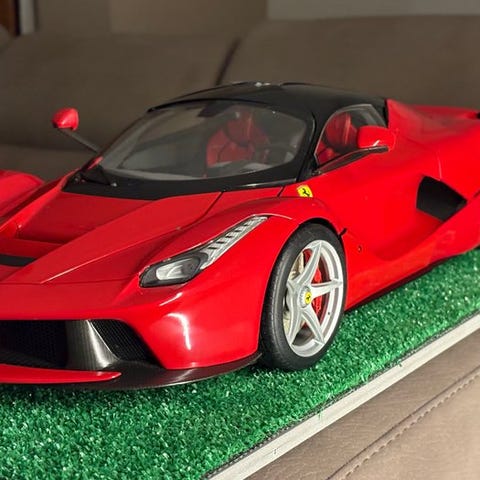Ferrari La Ferrari Centauria i skala 1:8 med karrosseri i malet metal, udstyret med et elektrisk anlæg, der betjener forlygter og baglygter, blinklys, hornet, stoplygter, motorlyd og gaspedal, komplet med encyklopædi til montage og beskrivelse af bilens historie på italiensk. Har nogle fejl: hestens emblem mangler bagpå, forreste vinduesvisker ødelagt (til stede men brudt), forruden ikke helt tætsiddende.