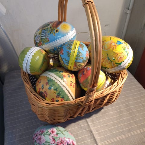 Bugs Bunny påskefigur med æg og kurv. Figuren forestiller Bugs Bunny, der holder farvede påskeæg ved siden af en flettekurv fyldt med æg. På bagsiden står teksten "Happy Easter" på et skilt. Figuren står på en grøn base og er ca. 10 cm høj ifølge målepinden på billedet. Velegnet som påskepynt eller samlerfigur.