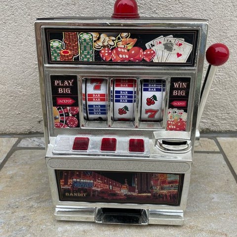Monte Carlo Jackpot, spilleautomat i bronzefarvet metal og træ, testet og i funktion, oprindelse Nordamerika (Texas, USA), periode 1960-1970, i god stand med brugsspor og pletter pga. alder, mål 25x17x16 cm, vægt 2500 g. Klik på den blå "gå til varen" knap, for at købe eller byde på denne vare. Den samlede pris vil blive vist inden du afgiver dit bud.