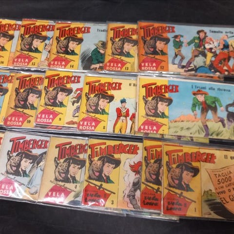 Timbergek, Vela Rossa-serien, stripeformat komplet serie, første udgave 1959, 20 italienske tegneserier, binding Spillato, kunstner Pietro Gamba, tilstand Fremragende. Klik på den blå "gå til varen" knap, for at købe eller byde på denne vare. Den samlede pris vil blive vist inden du afgiver dit bud.