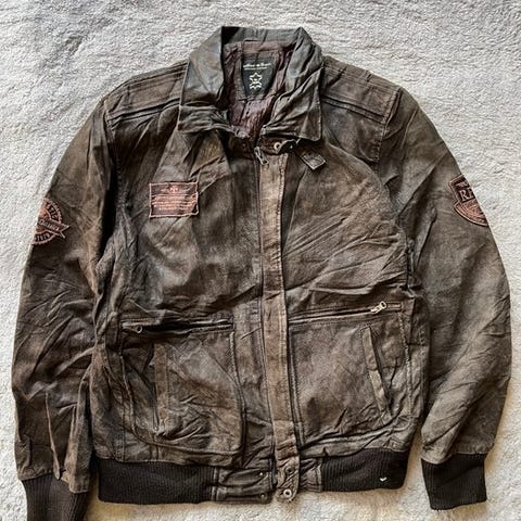 U.S. Force – Læderflyverjakke til mænd, beige, størrelse L, i god stand med let slitage og varm indvendig foring. Klik på den blå "gå til varen" knap, for at købe eller byde på denne vare. Den samlede pris vil blive vist inden du afgiver dit bud.