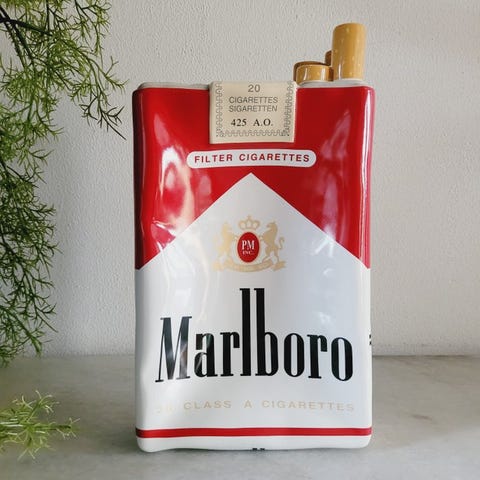 Tilbudt til auktion: en yderst sjælden og ikonisk XL byttepengebeholder (monnayeur) fra Marlboro, fremstillet af høj kvalitet rød- og hvid keramik. Denne specifikke model er udformet som en detaljeret 3D-reproduktion af den klassiske "soft pack" (blødt cigaretpakke), inklusive de karakteristiske folder i designet og de fremtrædende cigaretfiltre øverst.