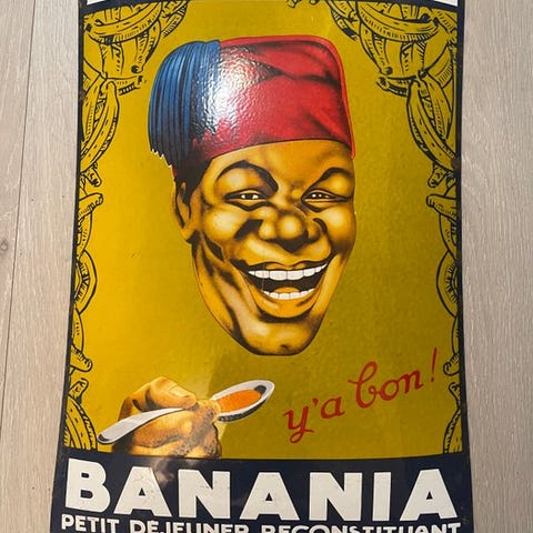 længde 30 cm. højde 40 cm. bord. forsendelse med tracking. During a visit near Lake Managua, Nicaragua in 1909, the journalist Pierre Lardet discovered the recipe for a cocoa-based drink. When he returned to Paris, he started its commercial fabrication and, in 1912, began marketing Banania with the picture of an Antillaise. Hendes billede blev i 1915 erstattet med tegningen af en bredt smilende senegalesisk mand.