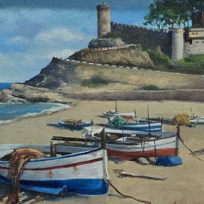 Pictura Galeria præsenterer dette magniske kunstværk tilhørende Domingo Abelló, som forestiller en kystbugt omgivet af bakker og en lille landsby, hvor en fartøj sejler over havet og vækker roen og skønheden i det maritime landskab. Maleriet udmærker sig ved sin fremragende teknik og den store billedkunstneriske kvalitet, som det formidler.
