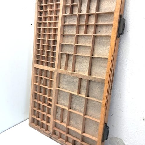 Originalt træ trykkeri-skuffe fra Nederlandene, ca. 1930–1940, 83 × 53 × 4 cm, vægt 4,7 kg, model Printers tra, med mange rum til småting, i god stand med små slidmærker. Klik på den blå "gå til varen" knap, for at købe eller byde på denne vare. Den samlede pris vil blive vist inden du afgiver dit bud.