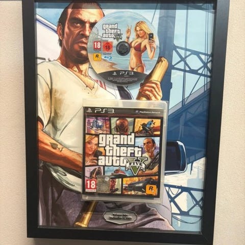 Indrammet samlerudstilling til Fallout: New Vegas PS3, år 2010, i meget pæn stand, med original PS3-disc, originalt spilcover, grafisk baggrund inspireret af New Vegas og sort ramme, størrelse 30x40 cm. Klik på den blå "gå til varen" knap, for at købe eller byde på denne vare. Den samlede pris vil blive vist inden du afgiver dit bud.